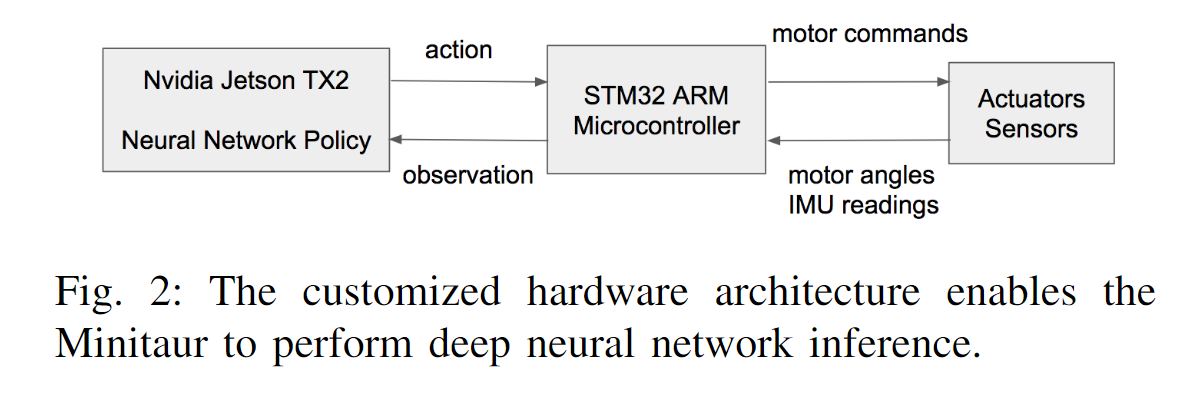 The Nvidia Jetson TX2 acts as the high-level controller, performing neural network policies learned from deep RL. The STM32 ARM microcontroller serves as the low-level controller, executing position control for the motors. The TX2 interfaces with the microcontroller via UART communication. At every control step, sensor measurements are collected at the microcontroller and sent back to the TX2, where they are fed into a neural network policy to decide the actions. These actions are then transmitted to the microcontroller and executed by the actuators (Figure 2).